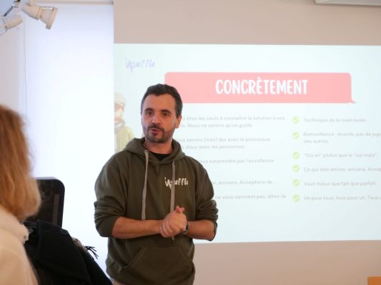 Encadré par des comédiens professionnels, le groupe explore l’écoute active, la réactivité, l’acceptation de l’incertitude. Les saynètes sont construites à partir de situations professionnelles vécues. L’atelier se termine par un forum ouvert : “Quelle posture souhaitons-nous incarner au quotidien ?” C’est drôle, mais exigeant.